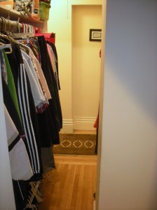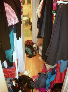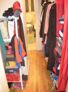 We have a great layout here: we can walk through the closet and into the bathroom from the hallway (which can prove very confronting to those utilizing the loo, so we installed a curtain for privacy). But as you can see from these pictures, there’s not a lot of actual walking through that has been happening in here of late.